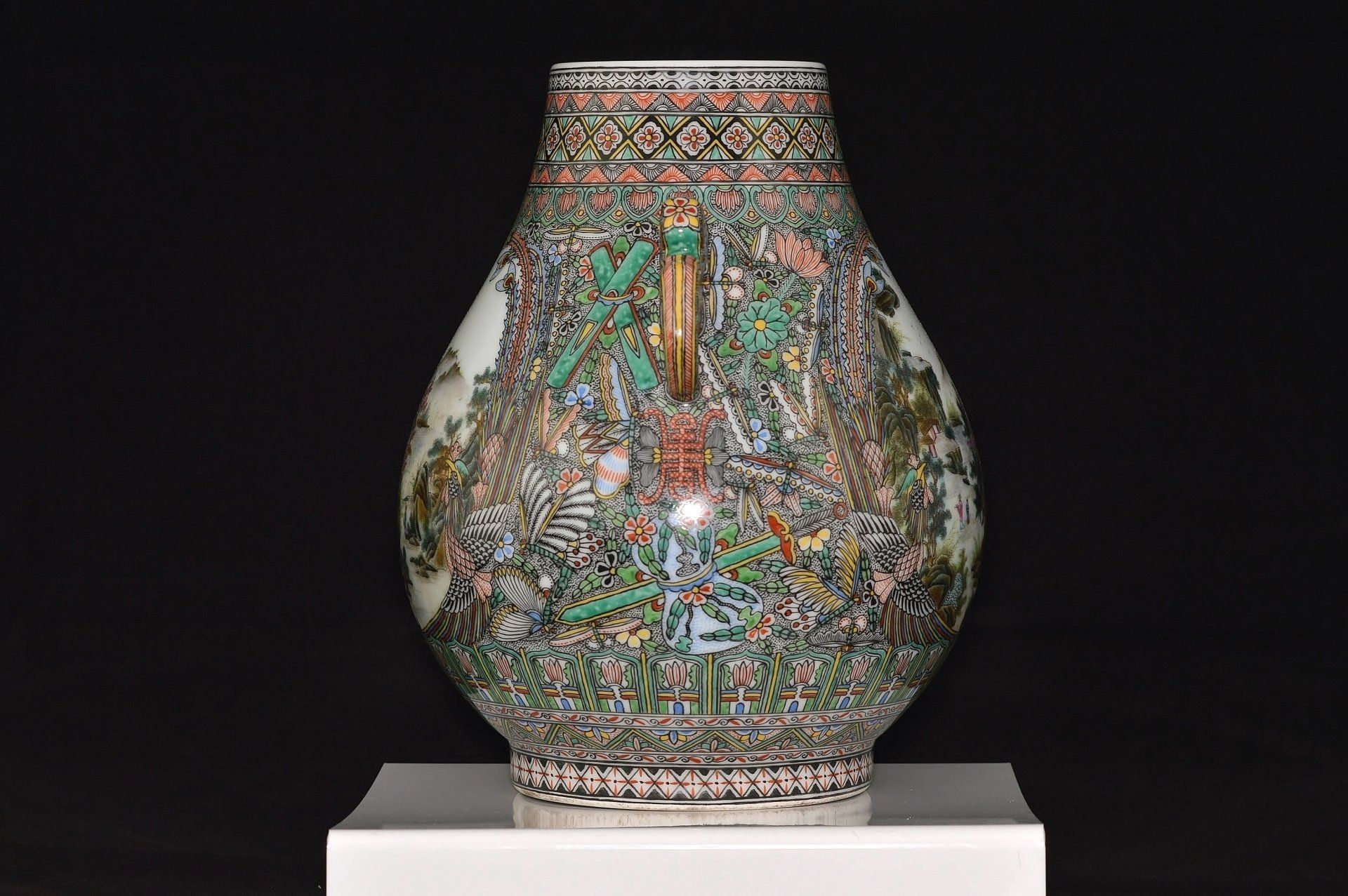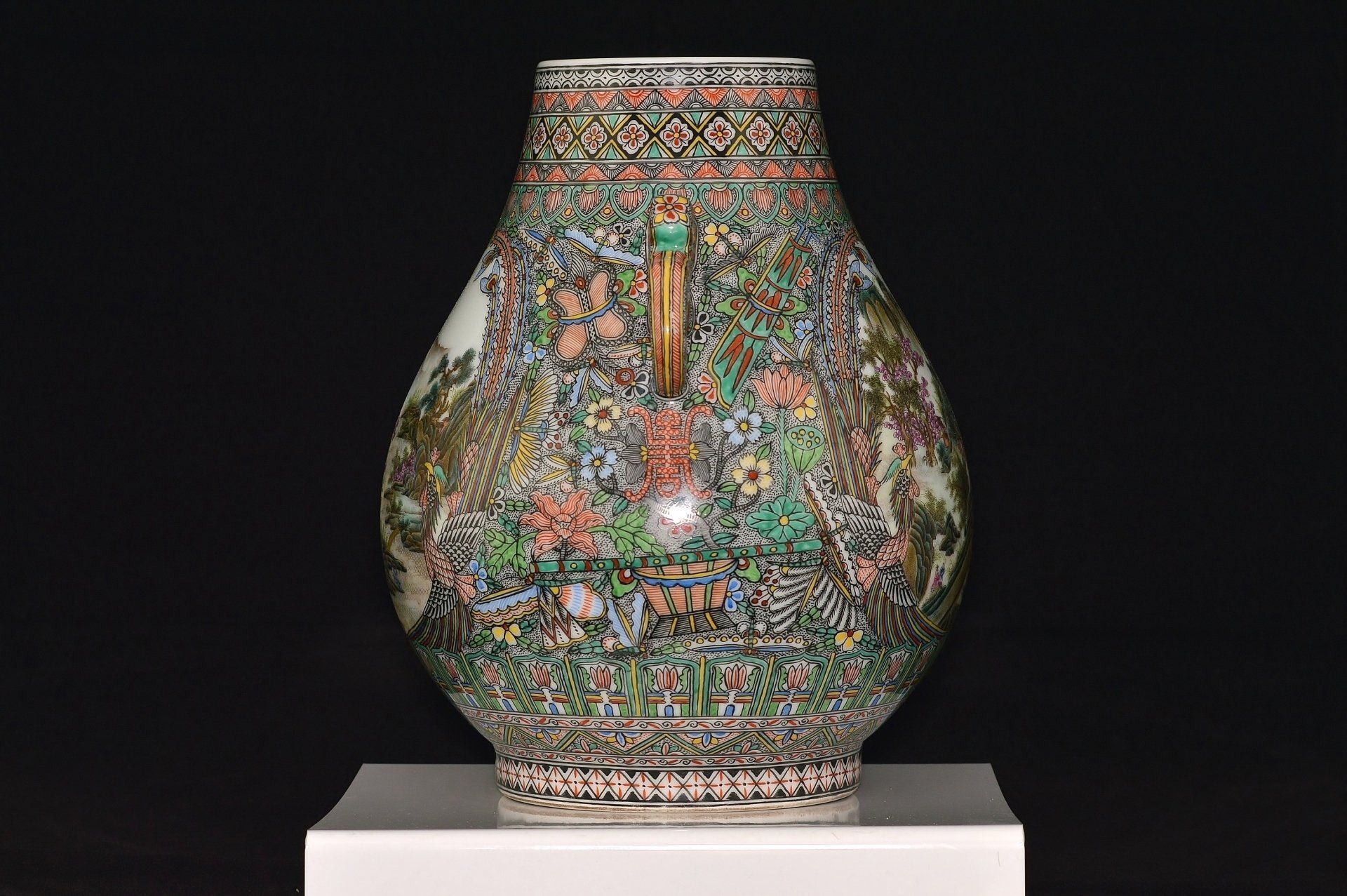 Highly Uncommon Qing Dynasty Vase Featuring Islamic Influences: Imperial Qianlong Mark and Period Famille Rose Landscape Hu Form
