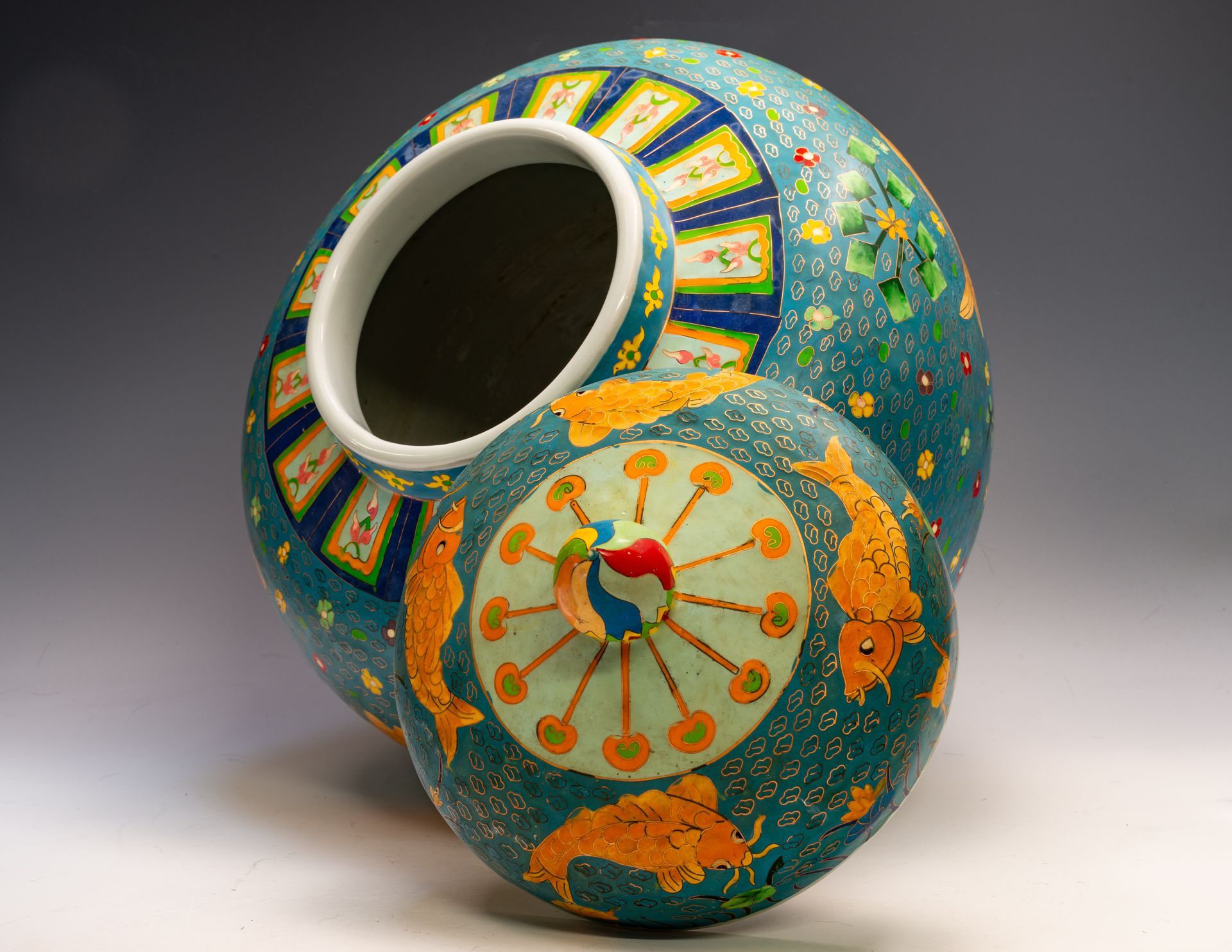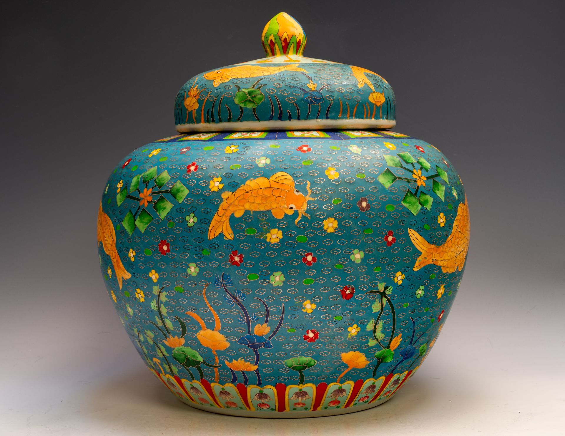 Exceptional Cloisonné Jar and Lid with Fish Motif from the Ming Dynasty, Mark and Period of Jiajing