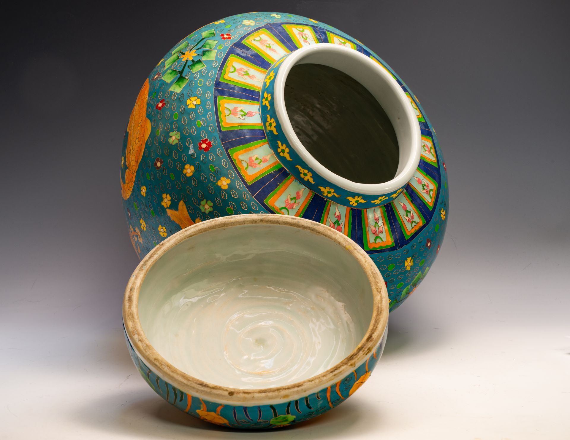 This exceptional Jiajing Cloisonné Fish Jar with Lid, distinguished by its remarkable rarity and importance, originates from the Ming Dynasty. The Jiajing period, spanning from 1522 to 1566, is renowned for its exquisite Fish Jars, and this particular piece exemplifies the mastery of cloisonné craftsmanship. The jar exhibits minor flaking in the biscuit, a testament to its historical authenticity. This extraordinary work of art stands at an impressive height of 15 1/2 inches. ppjrs