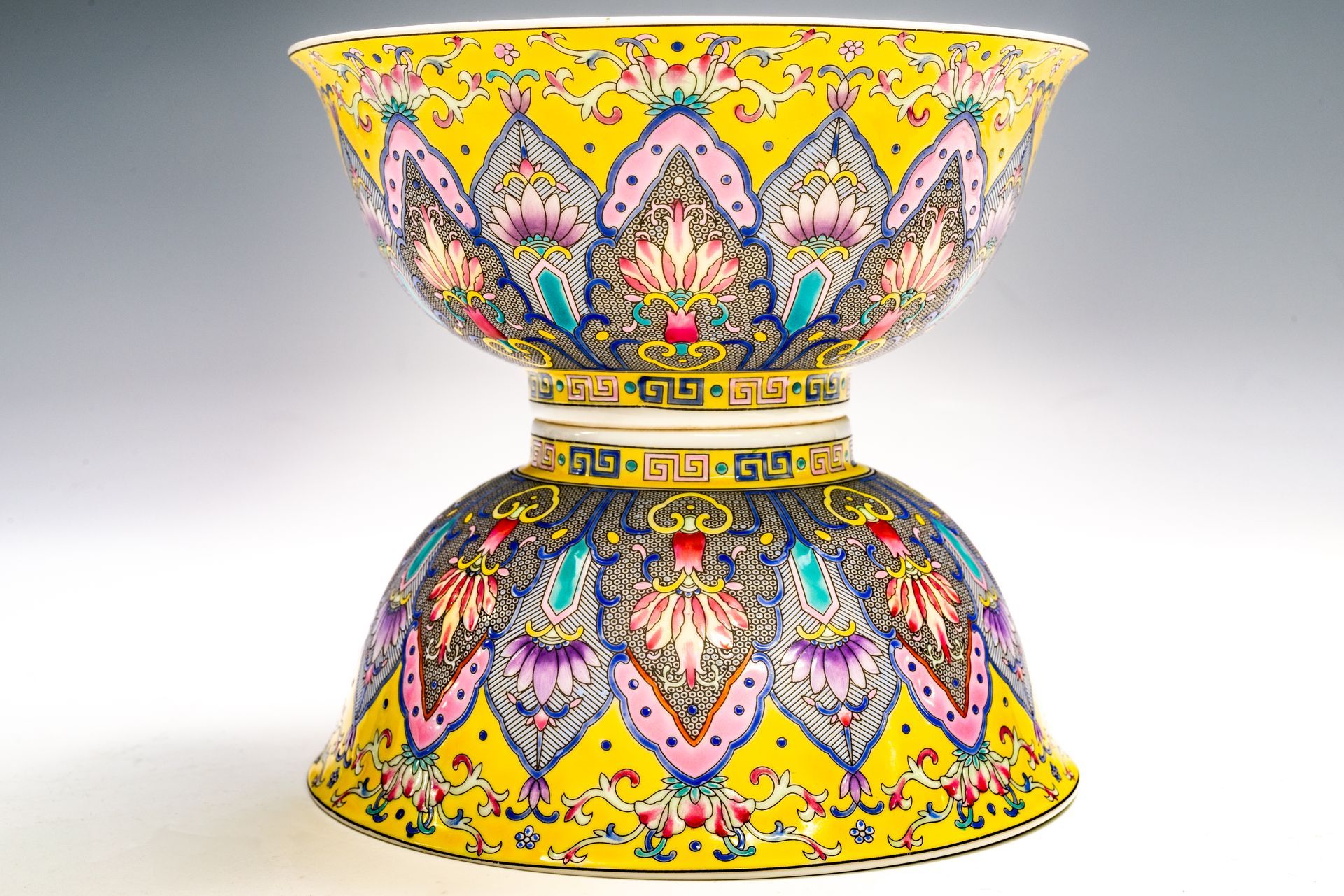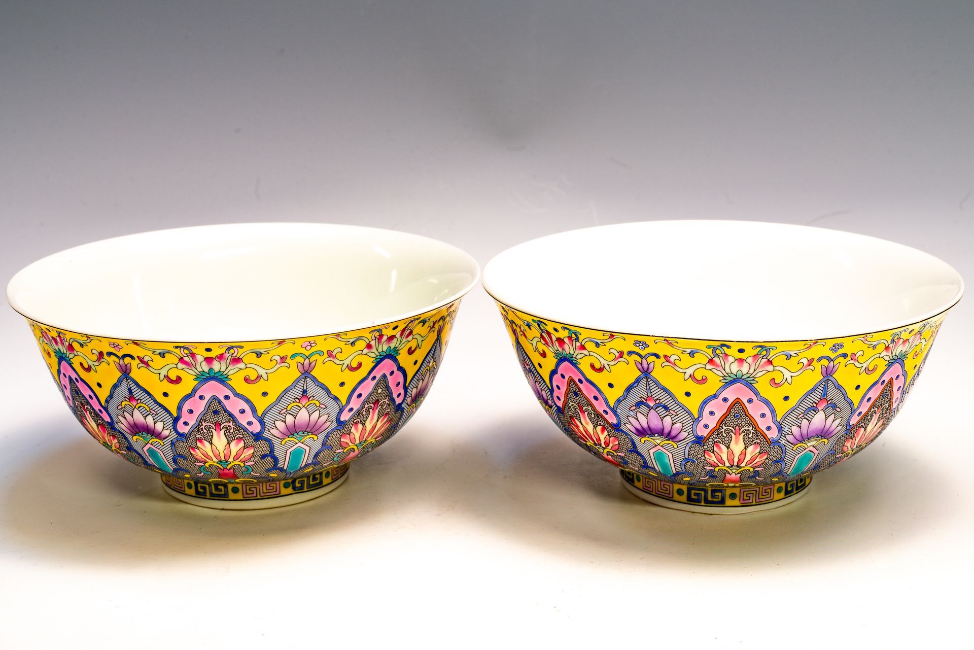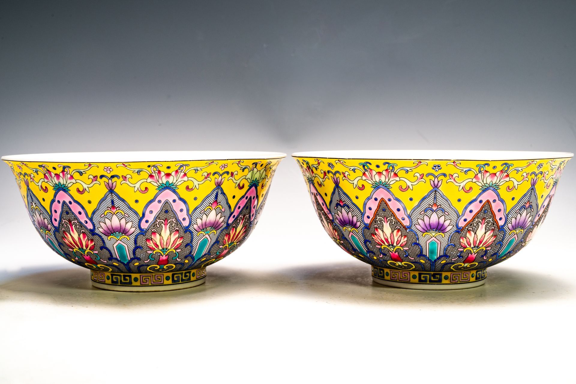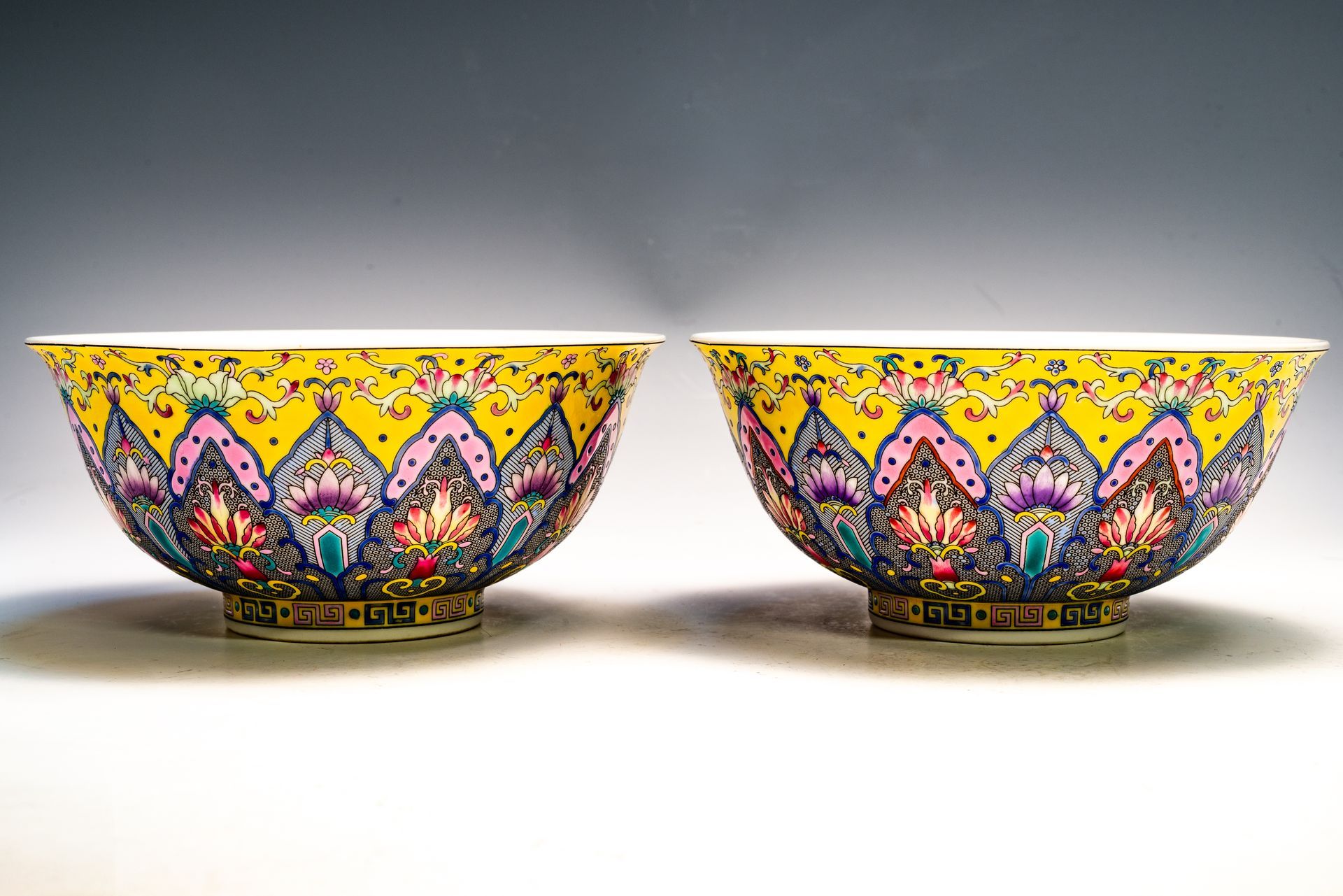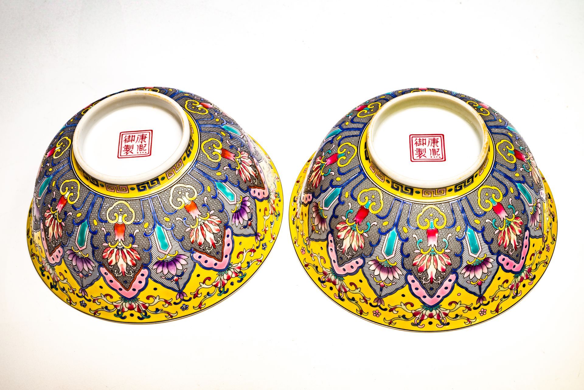 A Pair of Imperial Qing Dynasty Kangxi Yellow Ground Falangcai Enamel Bowls, Featuring a Deep Pink Four-Character Yuzhi Mark in a Double Square, Dating from the Kangxi Period