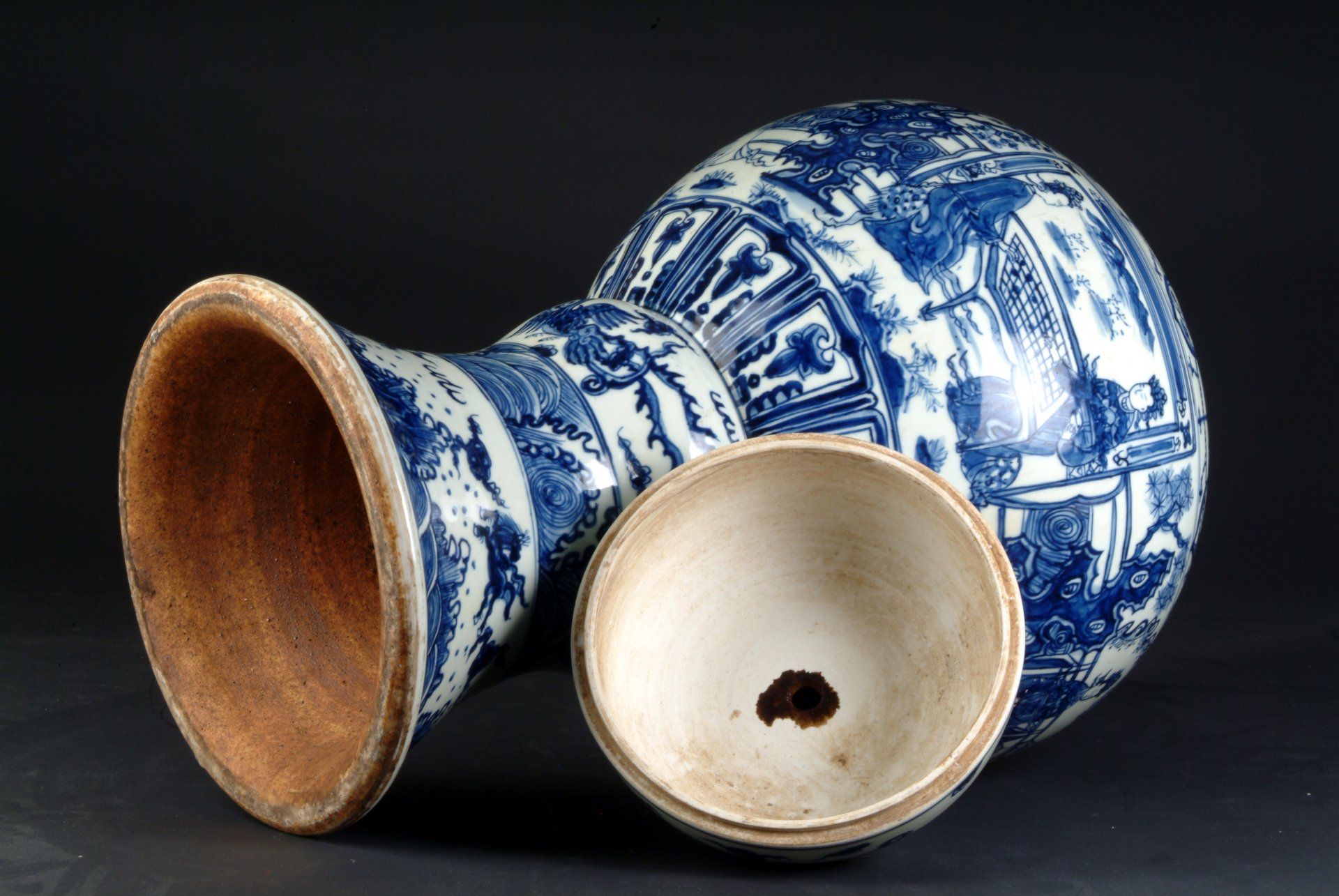 This exceptional blue and white figure jar, originating from the Chenghua period of the Ming Dynasty, is an outstanding example of Imperial craftsmanship. Characterized by multiple decorative bands, the principal band narrates a figurative story, showcasing the artistry of this striking piece. Notably, this jar is unusually large for Chenghua wares, making it a rarity that even seasoned experts cannot overlook. The Chenghua period extended from 1465 to 1487, and the jar features the six-character Chenghua mark inscribed on the second decorative band. Extensive research through auction catalogs, publications, and museum collections reveal that larger examples of Chenghua jars have yet to be documented. The jar exhibits an exquisite form, vibrant color, and is adorned with fluid brush strokes, which are hallmarks of the finest Chenghua pieces. Among Chinese ceramics, blue and white wares from this era are regarded as the most desirable. The distinctive cobalt used during the Chenghua period facilitates easy differentiation from wares of other times, displaying a unique blackish tone attributed to the imported cobalt, believed to derive from Persia, though the precise location remains unidentified. This particular cobalt, known as Samali blue, has not been imported for over 500 years. Additionally, local cobalt, termed Pitang, was utilized during this period. Imported cobalt was prone to running, prompting artisans to blend it with local variants, resulting in a range of refined hues. Chenghua wares are characterized by fine outlines filled with broad brush strokes rendered in a loose, free style. The refinement of clay during this period surpassed all predecessors, and the high firing temperatures sometimes resulted in a slightly burnt or mottled appearance, as observed on the base of this jar. The glaze, notable for its fineness, displays minute, uniform bubbles that can be discerned using a loupe. This piece exhibits flaking in the biscuit, serving as testament to its age and authenticity. In summary, few treasures surpass the authenticity and splendor of true Imperial blue and white Chenghua wares, measuring approximately 26 inches in height.