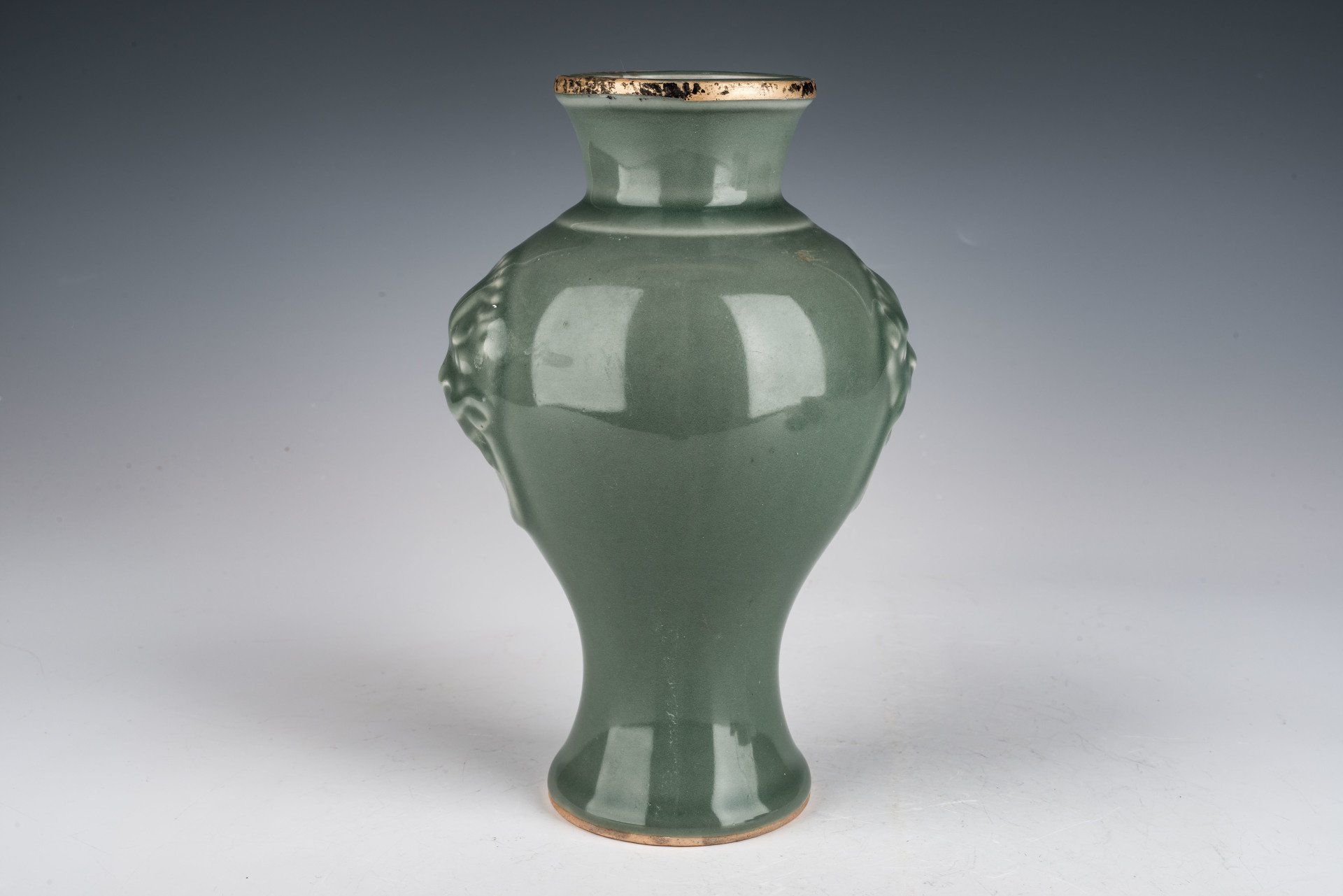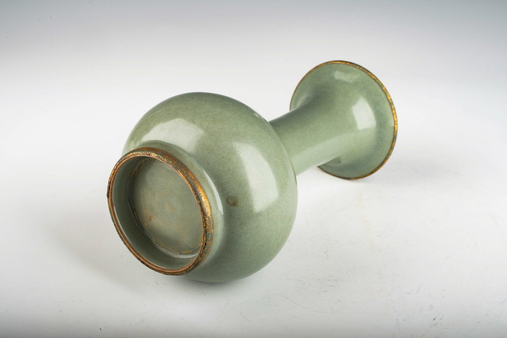 The Ru Kiln was commissioned to produce the exquisite second series of official Royal Imperial Celadon wares for Emperor Huizong and his court, these wares are characterized by their elegance, luxury, and aesthetic beauty, surpassing both merchant and tribute wares in refinement and size, while consistently showcasing a distinctive celadon hues. Notably, all pieces from this second series are infused with rare crushed blue agate within their glaze, an element observable through a 20x loupe, as evident in the microscopic photographs accompanying each piece. The use of crushed blue agate is exclusive to the Official Imperial Ru wares developed during Emperor Huizong’s reign. Furthermore, these second commissioned Royal Imperial wares exhibit a variety of unique forms that underscore the exceptional craftsmanship of the Ru kiln. The foot rings of these wares are unglazed and were intentionally fired flat within the kiln. Two vases feature fire gilding over copper bands exhibiting corrosion from cuprite and malachite, which serves as a reliable indicator of the artifact's age, more credible than thermoluminescence (TL) tests and widely acknowledged by experts to verify authenticity—an attribute that is impossible to replicate. It is important to note that all second commissioned Royal Imperial wares are unmarked. They possess an off-white biscuit that transitions to a brownish tone post-firing. The wares exhibit a rich, smooth glaze with no crackling, while some pieces feature fire gilding over copper bands, and those without bands likewise maintain a flawless glaze. The vase displayed, adorned with a gilded silver band, show minimal crackling, restricted to a few fine lines. The gilded silver band, exhibiting a darker celadon glaze enhanced with rare blue crushed agate, is clearly visible under magnification. The fire gilding on silver bands have pores in the gild, allowing tarnish to seep through the pores, resulting in pronounced black corrosion on the bands. ppjrs