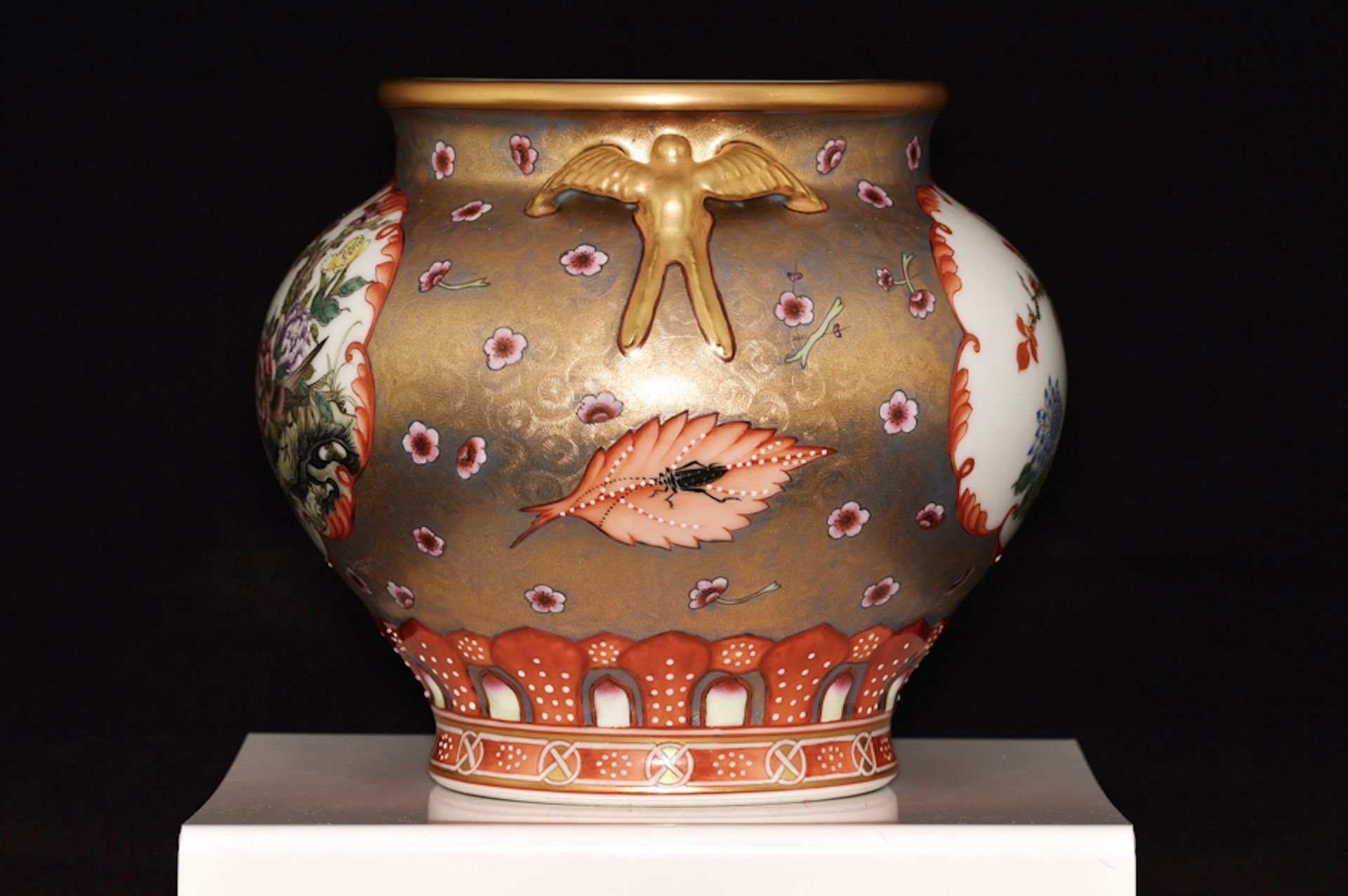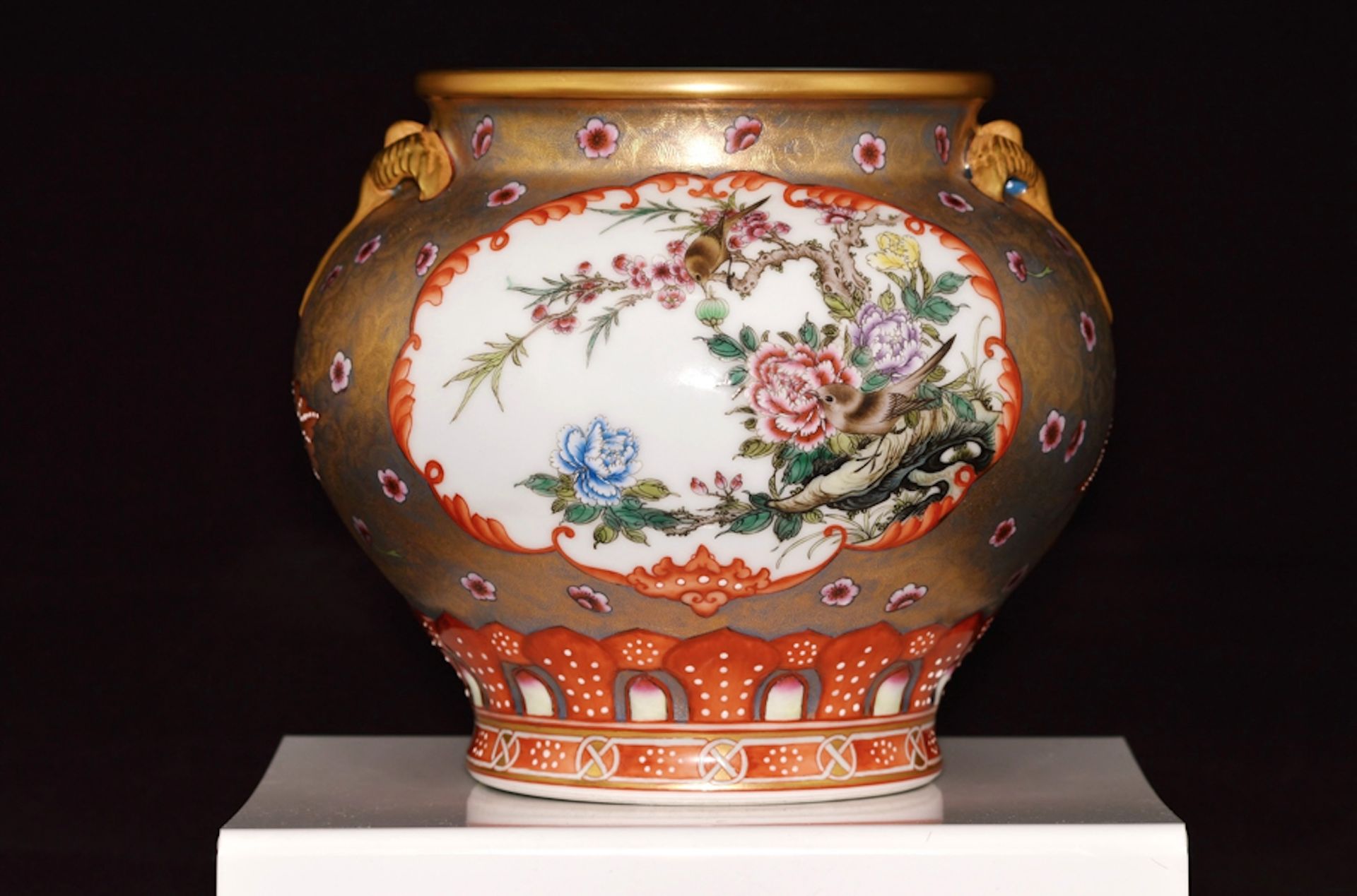 This Qianlong Famille Rose Guan-formed vessel represents the pinnacle of Chinese Famille Rose enamel porcelain artistry. It is arguably one of the finest examples ever documented and made available for acquisition. I invite you to reference your scholarly texts, explore auction catalogs, and consult major museums worldwide in search of a piece that may rival its unparalleled beauty and craftsmanship. The complexity of this vessel is remarkable, warranting an in-person examination to fully appreciate its exquisite details. The vessel features a multi-layered decorative scheme, with an elegant form defined by a striking blue ground that has been incised in a subtle wave-like pattern and subsequently adorned with gold accents. Scattered across the surface are delicate rose-colored blossoms that enhance its allure. The central panels exhibit masterful brushwork, showcasing branches embellished with blooming flowers and two magpie birds, all executed with an astonishing level of control—many strokes appearing to be applied with a single hair, a detail that becomes evident upon close inspection with a loupe. The panels are framed in iron red, while two leaves, also in iron red, bear intricately painted depictions of a cricket and a grasshopper. Two gold phoenix handles elevate the vessel's design, complemented by meticulously applied droplets of white enamel that accentuate the iron red throughout the piece. The interior and base are finished in a stunning turquoise hue. The color palette adheres to the esteemed Qianlong Famille Rose tradition, and the underside bears the Qianlong mark—positioned in alignment with the main panels, a characteristic typical of Imperial Qianlong pieces. Standing at 7 5/8 inches tall, this vessel epitomizes the high standards set for true masterpieces of Chinese porcelain. For any inquiries regarding this exceptional vessel, please do not hesitate to reach out.