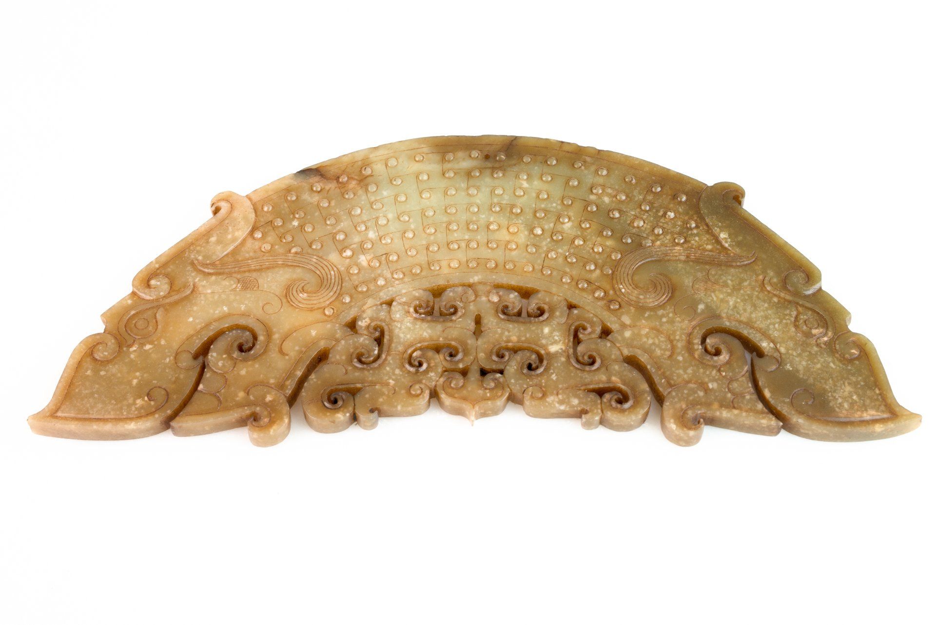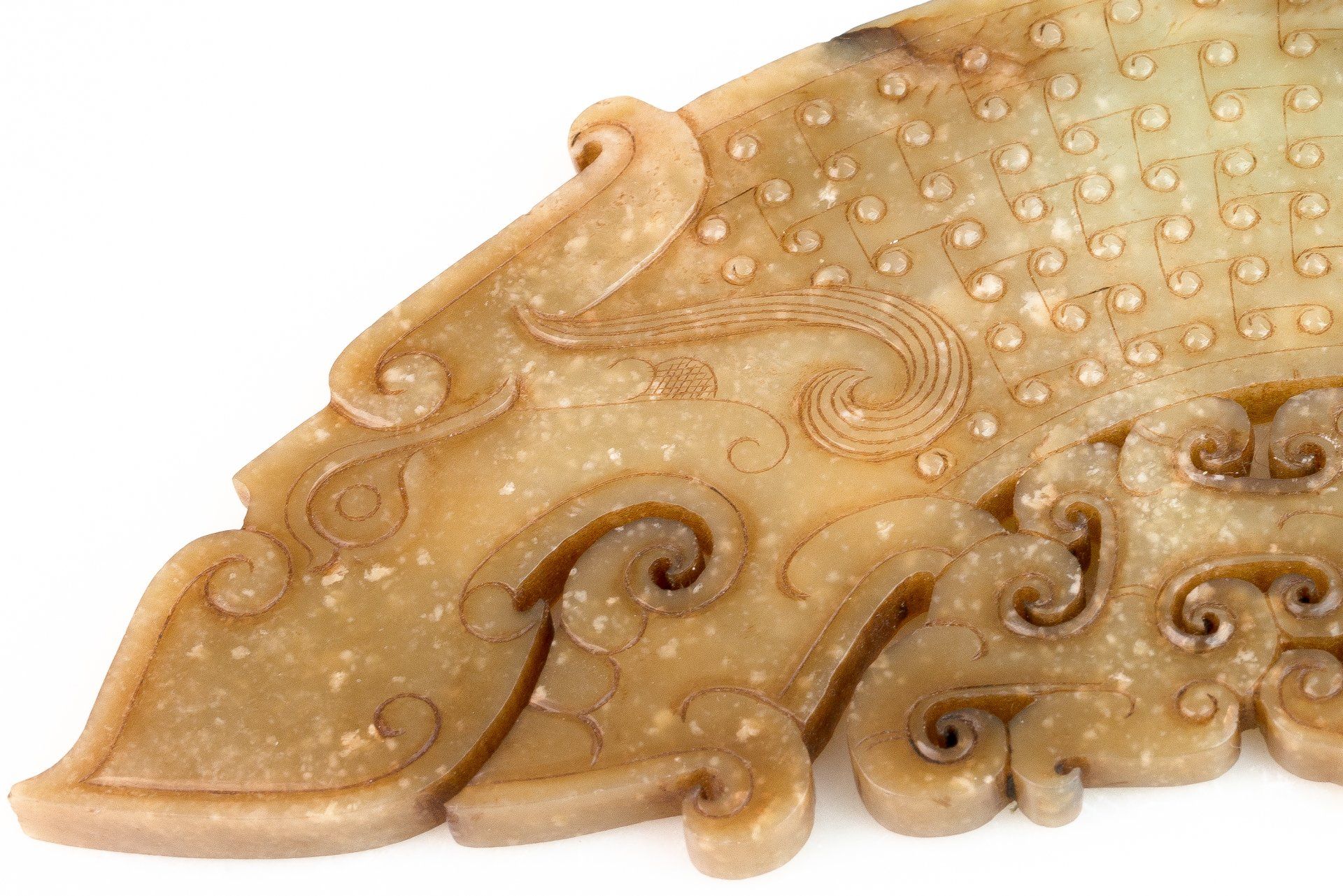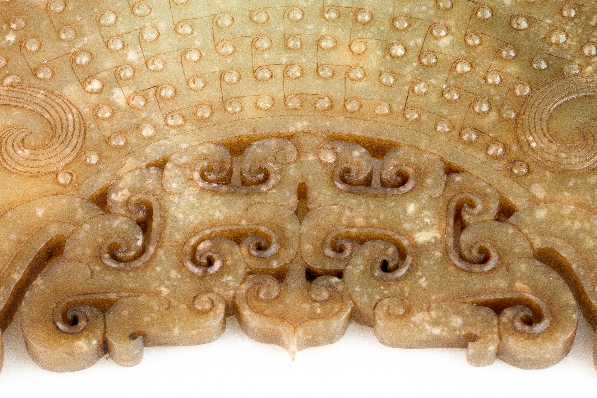 This remarkable piece of archaic jade from the Warring States period, situated within the Eastern Zhou Dynasty, exemplifies exceptional craftsmanship. The jade pendant, known as a Huang, is artistically shaped in an arc and features two intricately carved dragon heads, adorned with a textured grain pattern interspersed with openwork clouds. The material is a translucent celadon jade exhibiting inclusions that have imparted a brownish hue to much of the pendant, alongside localized areas of calcification. The carvings showcase unparalleled finesse, unmistakably marking it as an authentic artifact from this historical era. The delicate lines appear as though meticulously excavated in minute sections—an intricate technique observable only in the finest jade pieces of the Eastern Zhou Dynasty. Such precision necessitates the use of a quality loupe for proper examination. The precise nature of the tools employed in the creation of this piece remains unknown, leading to ongoing speculation; some theorize the use of diamond-tipped instruments akin to knives. Given that jade possesses a hardness comparable to steel, achieving such intricate detail without risking chipping, cracking, or fracturing the stone presents a conundrum that has intrigued scholars dedicated to the study of jade carvings. It is noteworthy that such craftsmanship is not reflected in any other periods throughout China's historical timeline. The Huang, crafted during the Warring States period (approximately 476 BC to 221 BC), measures approximately 9.25 inches in length and is equipped with a small conical pierced hole for suspension.