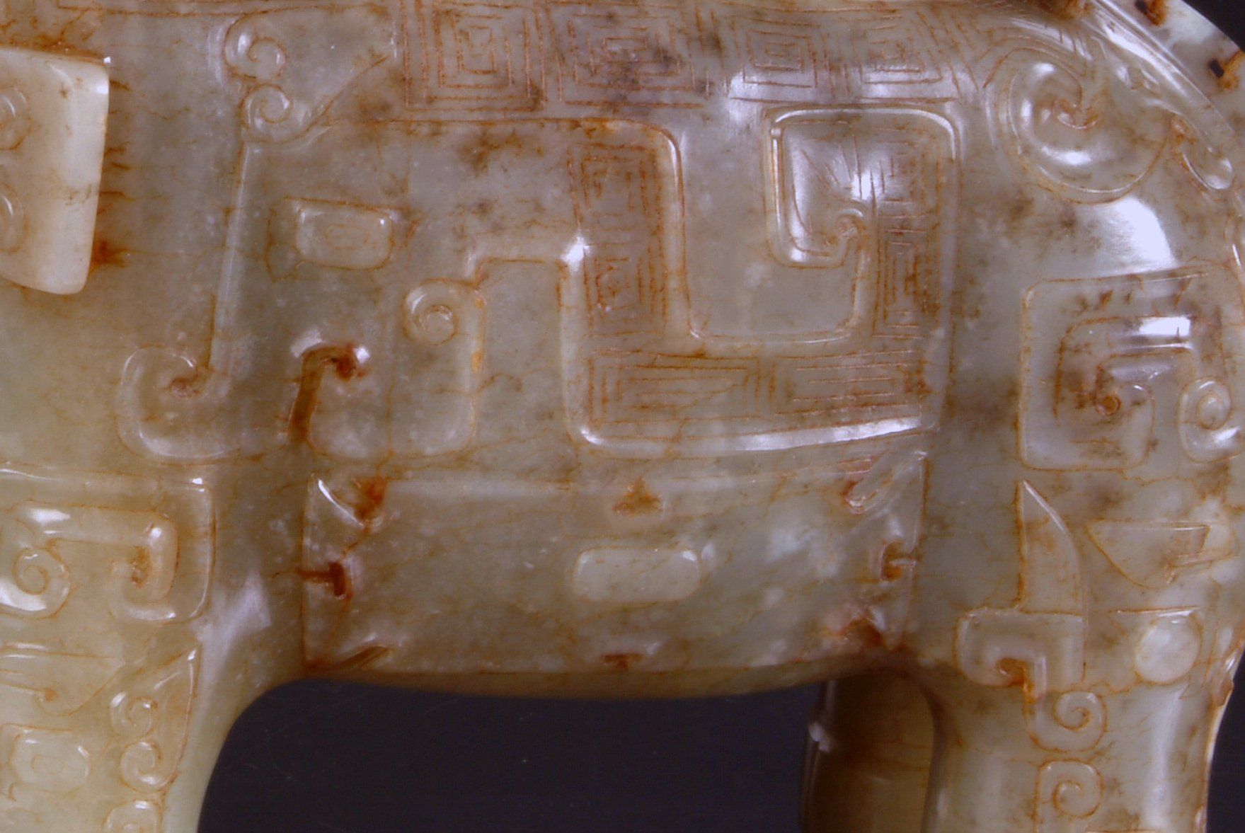 This exceptional Eastern Zhou pale celadon elephant vessel is a notable artifact from the period. It is masterfully carved, showcasing intricate and highly stylized details characteristic of the Eastern Zhou era. The lid is adorned with a finial in the form of a mythical bird. The translucent pale celadon jade features extensive brownish veining and inclusions, which further attest to its historical provenance. The vessel measures approximately 7 inches in length.