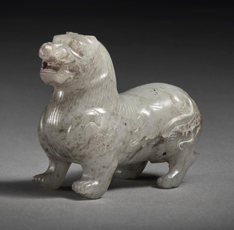 Ming Dynasty Pale Grayish-White Jade Reclining Mythical Creature Sculpture