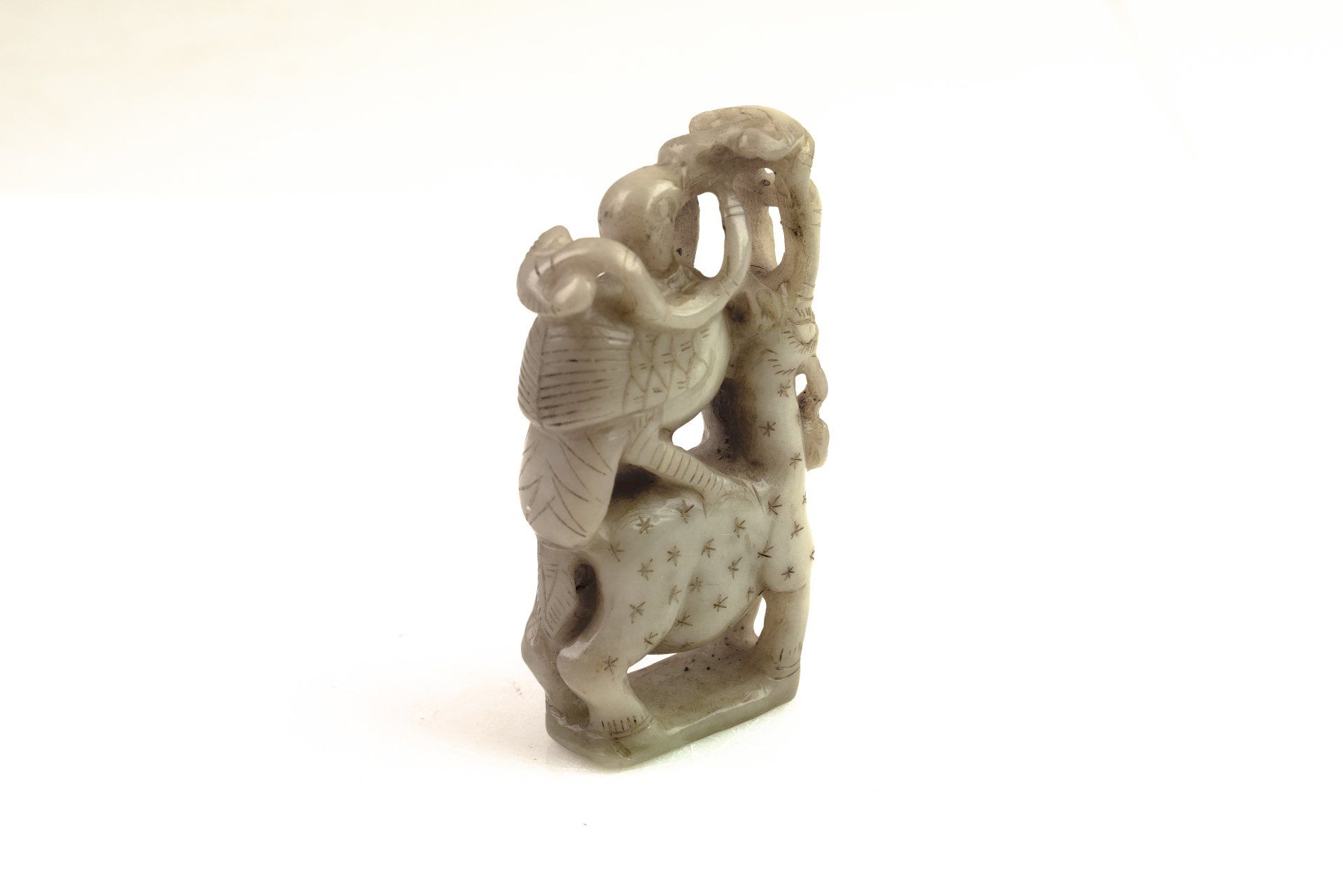 This exquisite Chinese fine art jade celadon statue depicts a reclining mythical creature, with one leg elegantly raised. The craftsmanship is exceptional, showcasing meticulous detailing in the representation of the creature's musculature, skin folds, and backbone. This unique piece originates from the Han Dynasty, which spans from 206 BC to 220 AD. The jade material exhibits a stunning celadon hue, accented by white and black speckled inclusions, while the specific carving style further corroborates its historical provenance. It is noteworthy that such a statue would have been a possession of the affluent class, as jade was considered more precious than gold during this era. The dimensions of the statue are approximately 4 inches in length.
