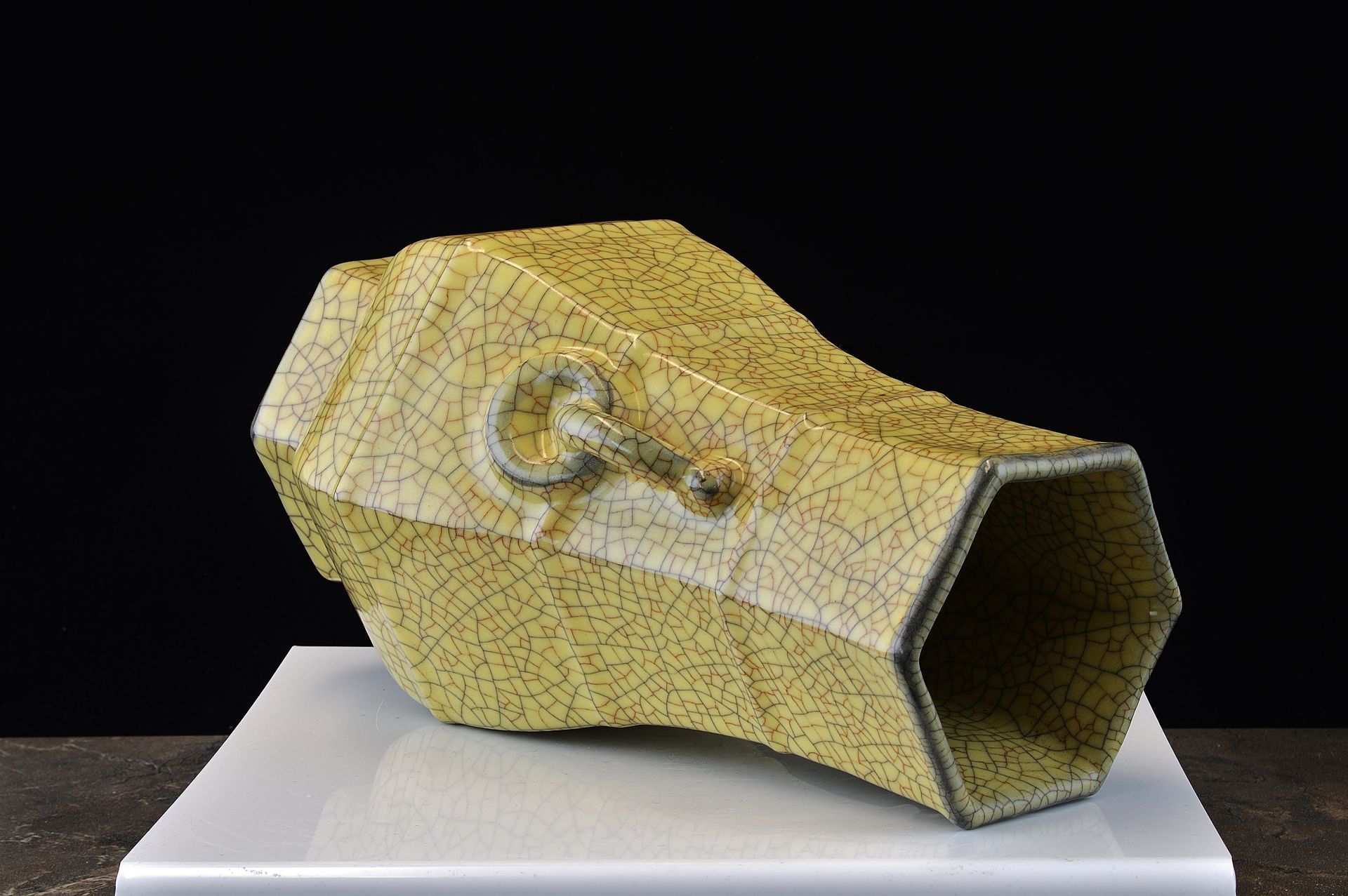 فرن جي من سلالة سونغ الجنوبية/يوان، مزهرية سداسية الشكل من خزف جي، تُظهر طقطقة خيط دم ثعبان البحر الرقيق، وقاعدة حديدية، بلون يُذكر بالقمح. يُعرف فرن جي بأنه فرن رائد من سلالة سونغ الجنوبية إلى سلالة يوان، ويبلغ ارتفاعه حوالي 10 بوصات. ppjrs