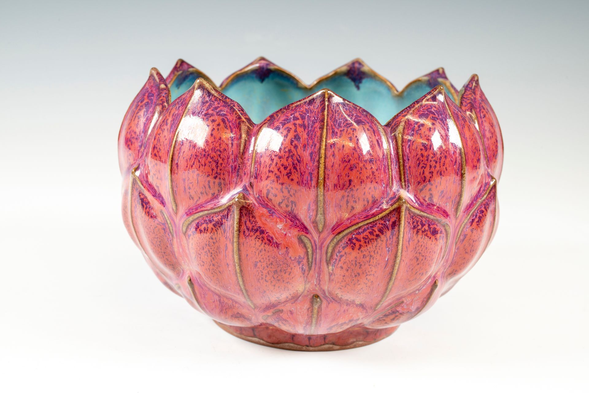 تتميز هذه القطعة الفنية الرائعة، التي تعود إلى أوائل عهد أسرة مينغ، بشكلها المثمن على طراز جون، بطلاء أزرق مائل للأرجواني، مع منطقة حمراء أسفل الحافة من الخارج. أما الجزء الداخلي، فيتميز بلون أزرق فاتح رقيق، بينما طُبّق طلاء بني داكن على السطح الداخلي حيث يخفّ الطلاء، بما في ذلك الحافة والحواف البنية الداكنة. ومن اللافت للنظر ظهور آثار ديدان على السطح الداخلي. القاعدة منقوشة بثلاث علامات مميزة. يبلغ قطر هذه الإناء 9 1/8 بوصة. ppjrs