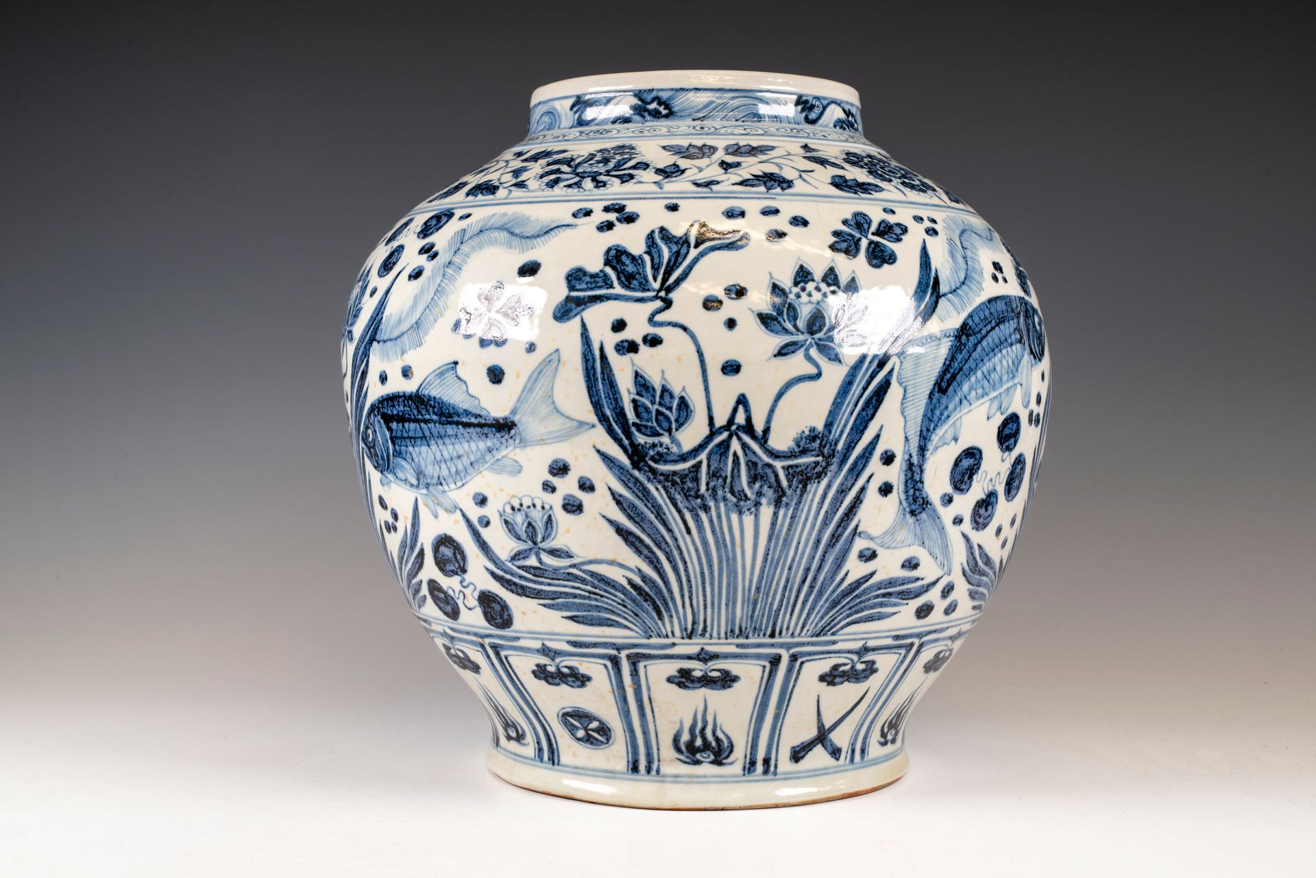 צנצנת כחולה ולבנה מתקופת שושלת יואן עם דגים בין צמחייה מימית