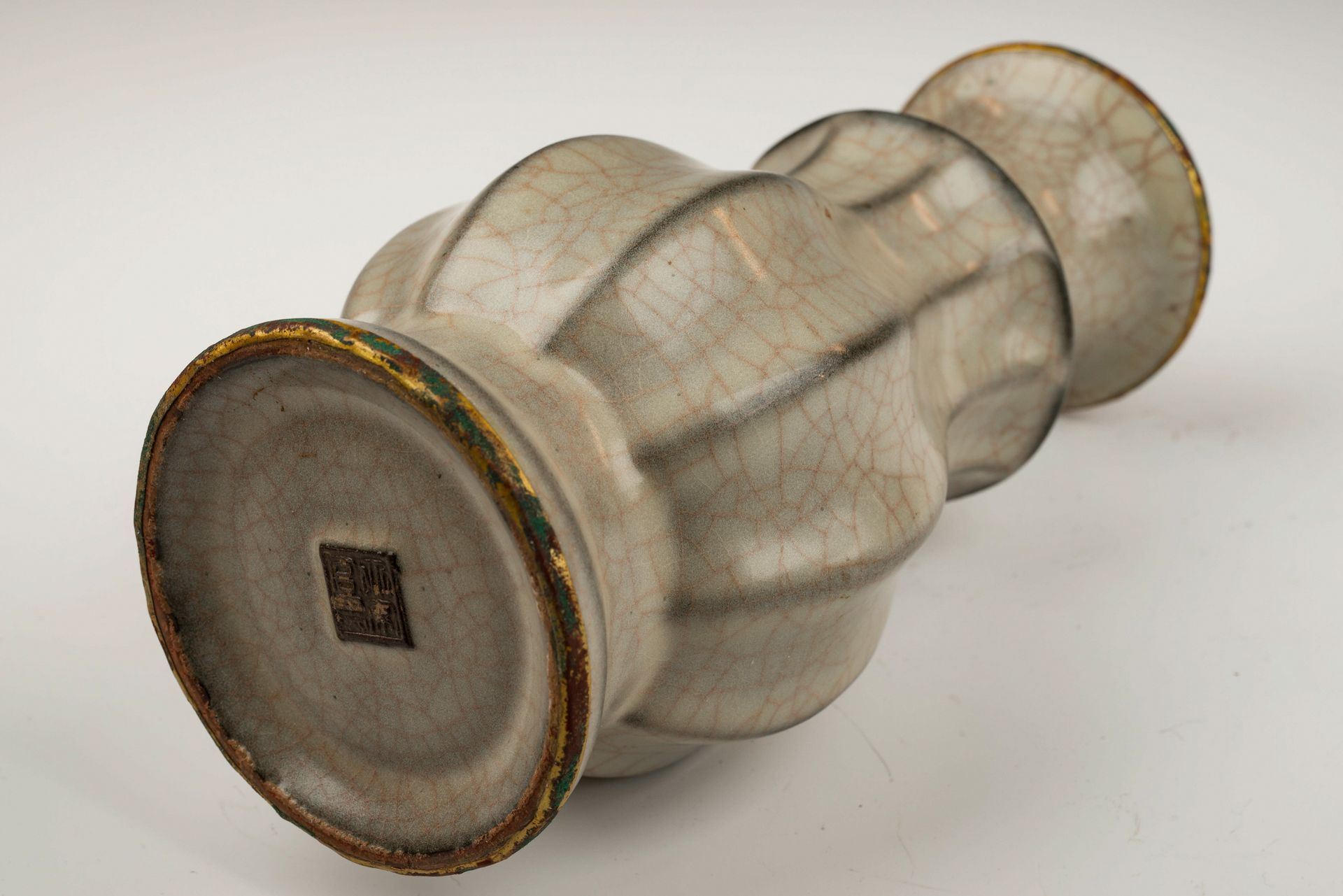 남송시대 공식 관요 꽃병: 금박 띠와 손잡이가 있는 갈라진 마감, 제국 관요의 작품