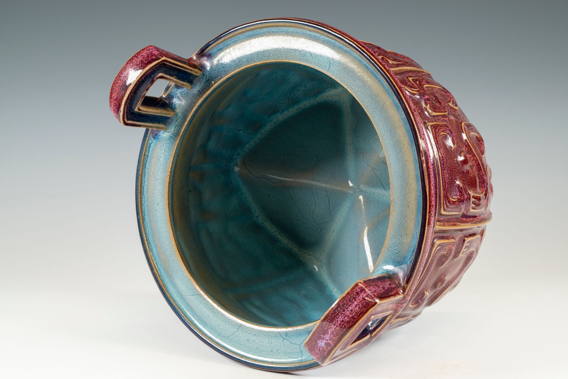 뛰어난 송/원나라 가마 가자미: 독특한 장어의 붉은색 딱딱거림과 3개의 양머리 손잡이가 특징인 대형 용기