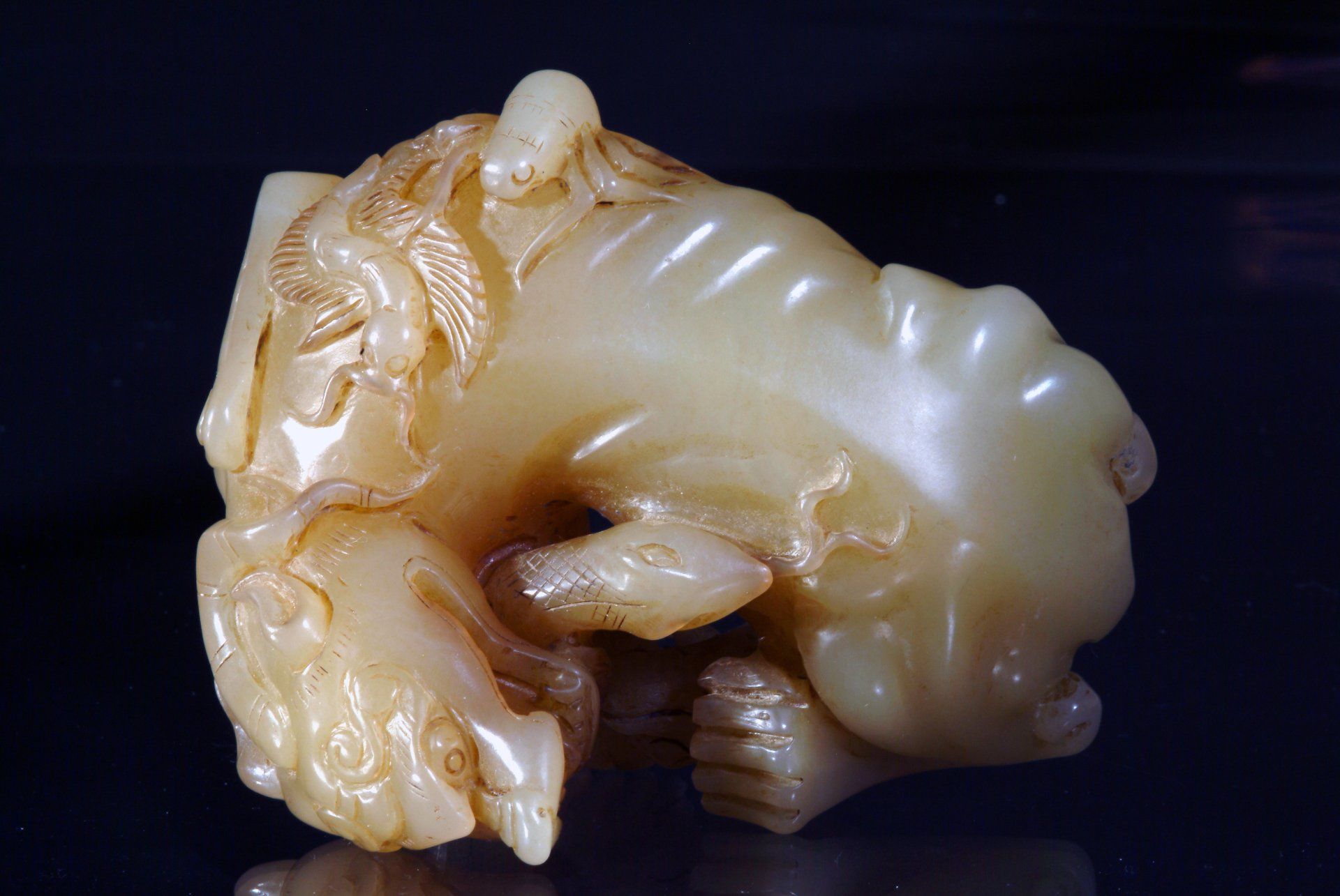 Ming Dynasty Yellow and Celadon Jade Kneeling Mythical Creature Sculpture