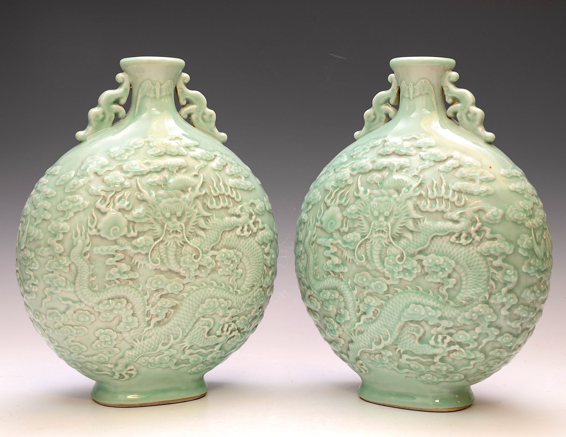 Imperial Qianlong Celadon Moon Flask Vases with Carved Dragon Motifs from the Qing Dynasty: Mark and Era Analysis