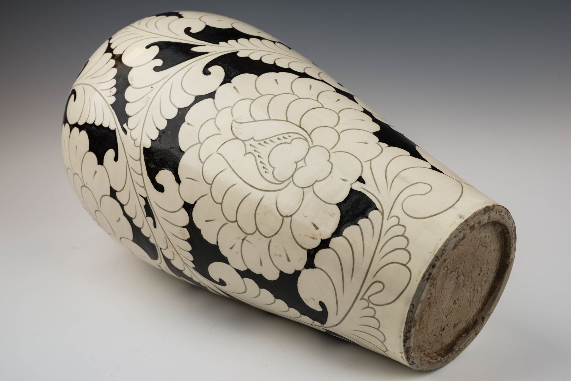 宋代或元代吉州窑磁州窑莲花菊花藤蔓在反彩梨形花瓶上。此花瓶原有白色泥浆,然后涂上黑色,以打造这款精美的反彩花瓶。饼干具有浅黄色的粗陶体花瓶高约 14 英寸。ppjrs