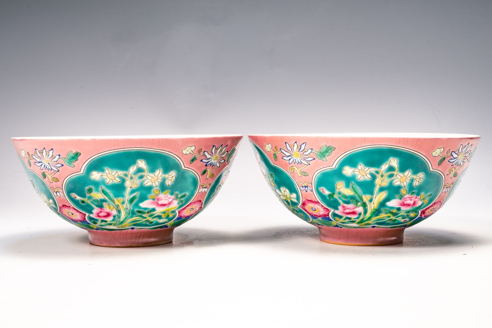 一对清康熙时期粉地珐琅彩碗,碗底有双方框,内有紫红色四字“玉治款”及“康熙年”字样。